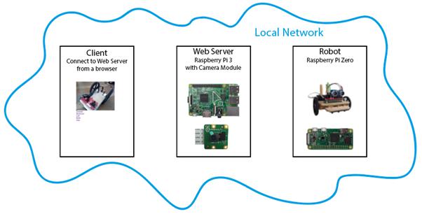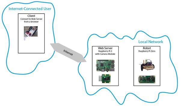 The web server is the computer that runs the web site. For our purposes, this will be a Raspberry Pi 3 with a connected camera. It handles requests from the client to see the web page and operate the robot. It has a camera that is used to see the robot. When it gets commands to operate the robot, it sends these commands over the network to the robot.